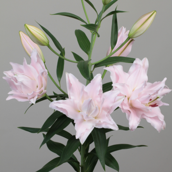 An Oriental Lily with pale pink, sweetly scented double flowers. Classified as pollen-free so it won’t drop yellow dust on your table or clothes! Flowers typically last longer than the normal single lilies.