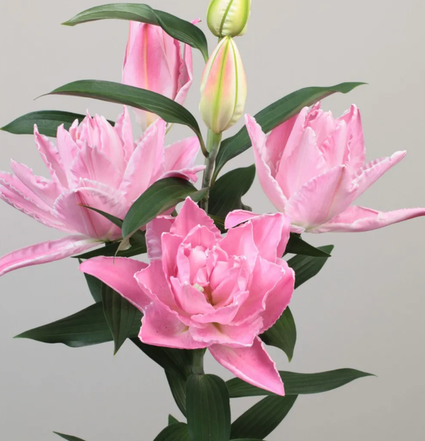 An Oriental Lily with a delightful rich pink color, broad petals, and a strong fragrance. The blooms are full of layered petals, which makes them perfect for eye-catching displays.
