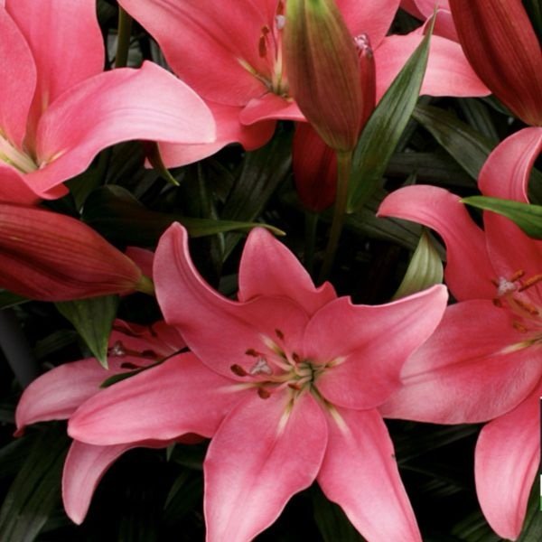 A Lily with a mixture of both creamy and bright pink colors. The blooms are rich, vibrant, upward-facing, and have little to no fragrance.